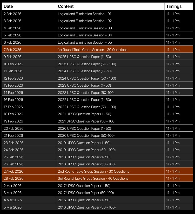 A 1 Month program with 5 Foundational Videos of 2 hours each, designed to master 15 elimination techniques for UPSC Prelims. Learn how to decode tricky questions, apply logic effectively, and solve with confidence through 10 (2025 - 2016) years of PYQs and 100 curated practice questions discussed interactively.