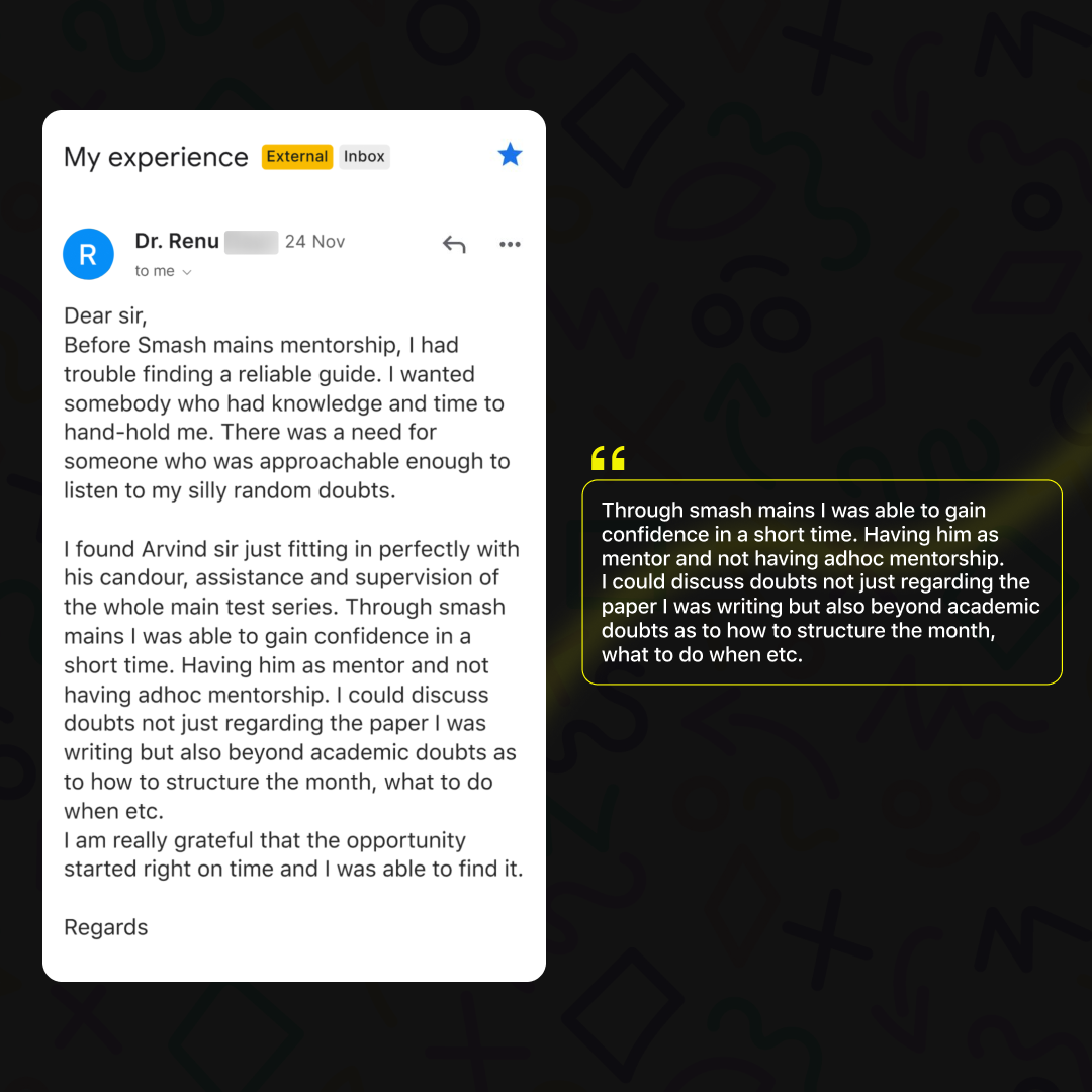 Last but not least, getting ‘Sharp Feedback’ from your Mentors on each attempted FLTs. Make all mistakes in your mocks. Smash Mains on D-Day!