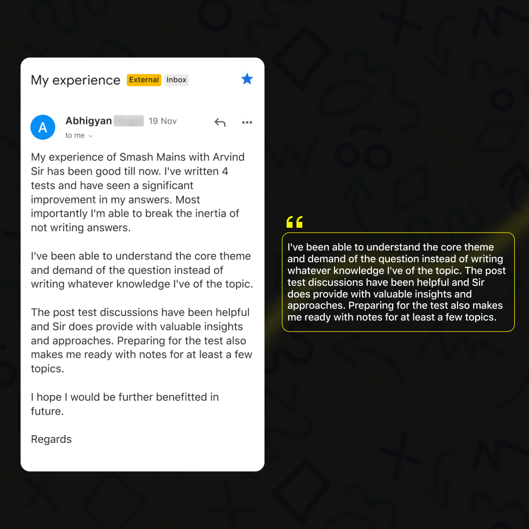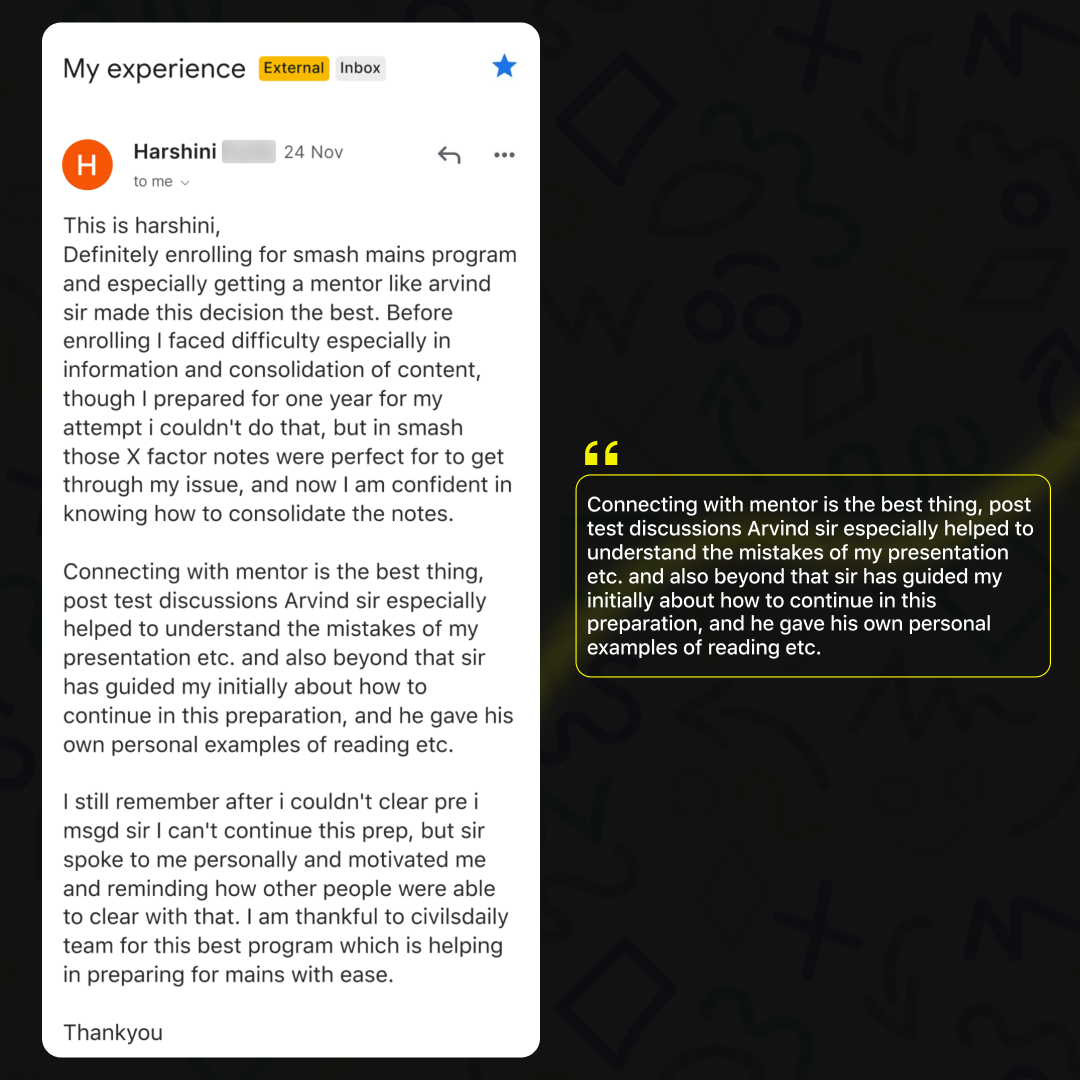 Each scored above 400 in their GS Mains papers, and their improvement was above 80 marks. If you want an IAS, IPS, IFS rank, 400+ in your UPSC attempt, Smashing Mains is a must. If you want to make your rank Interview-proof, aim for nothing less than 450+